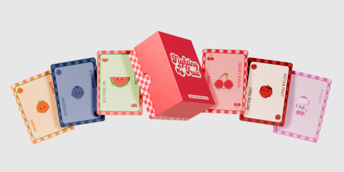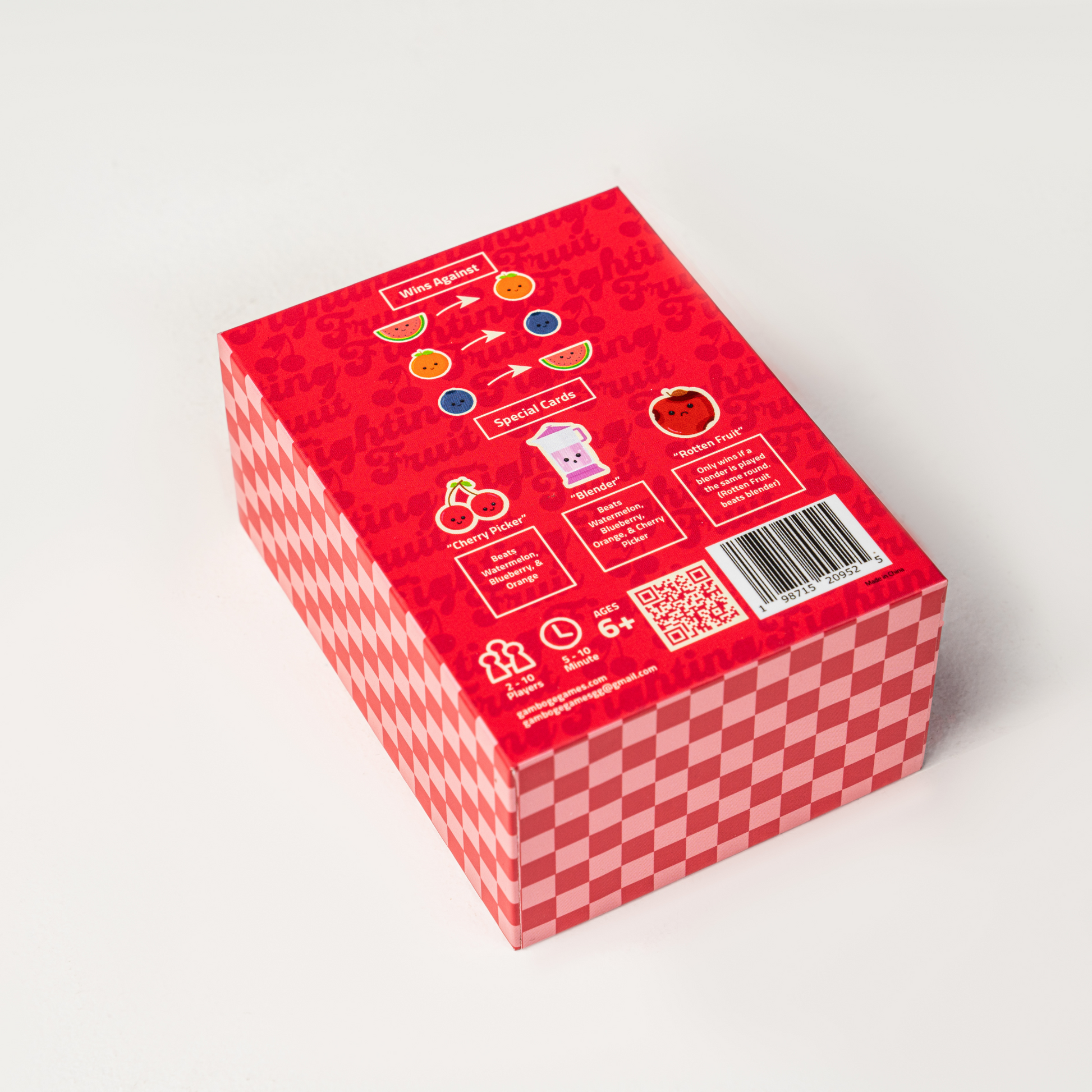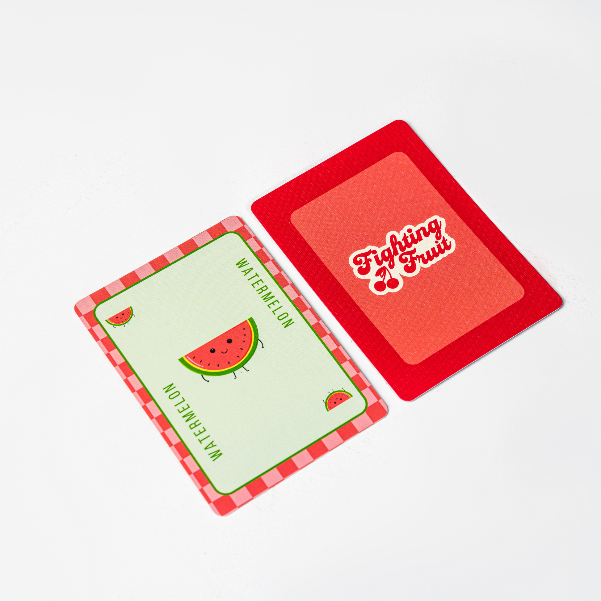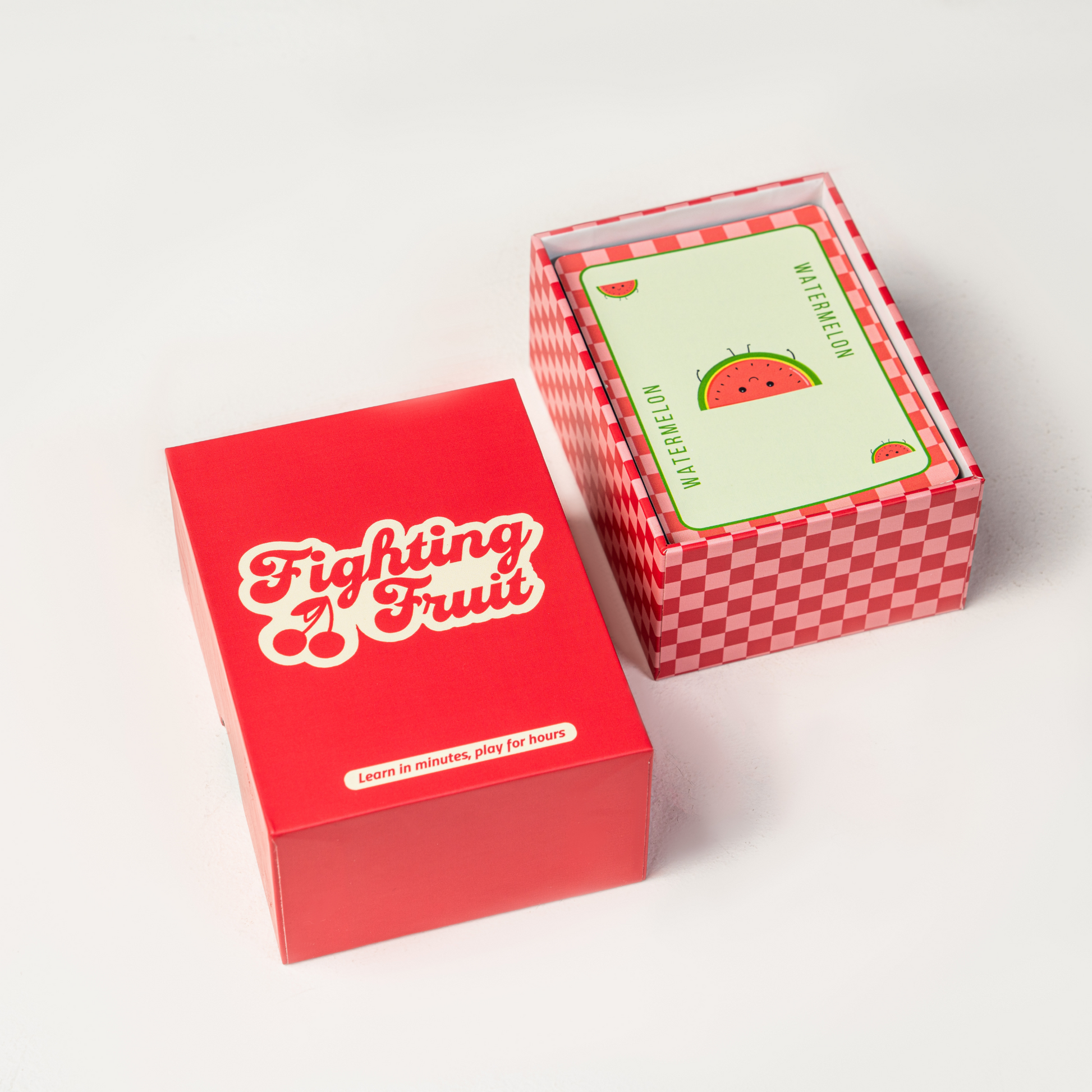 Fighting Fruit is a lively, fast-paced card game for 2-10 players where you battle it out in fruit duels to be the last player standing! The goal is to win rounds by playing cards that win the most hands and outlast your opponents. Each player starts with 5 cards, but only the winner of the round draws a new one—lose, and your hand shrinks, putting you at a disadvantage!